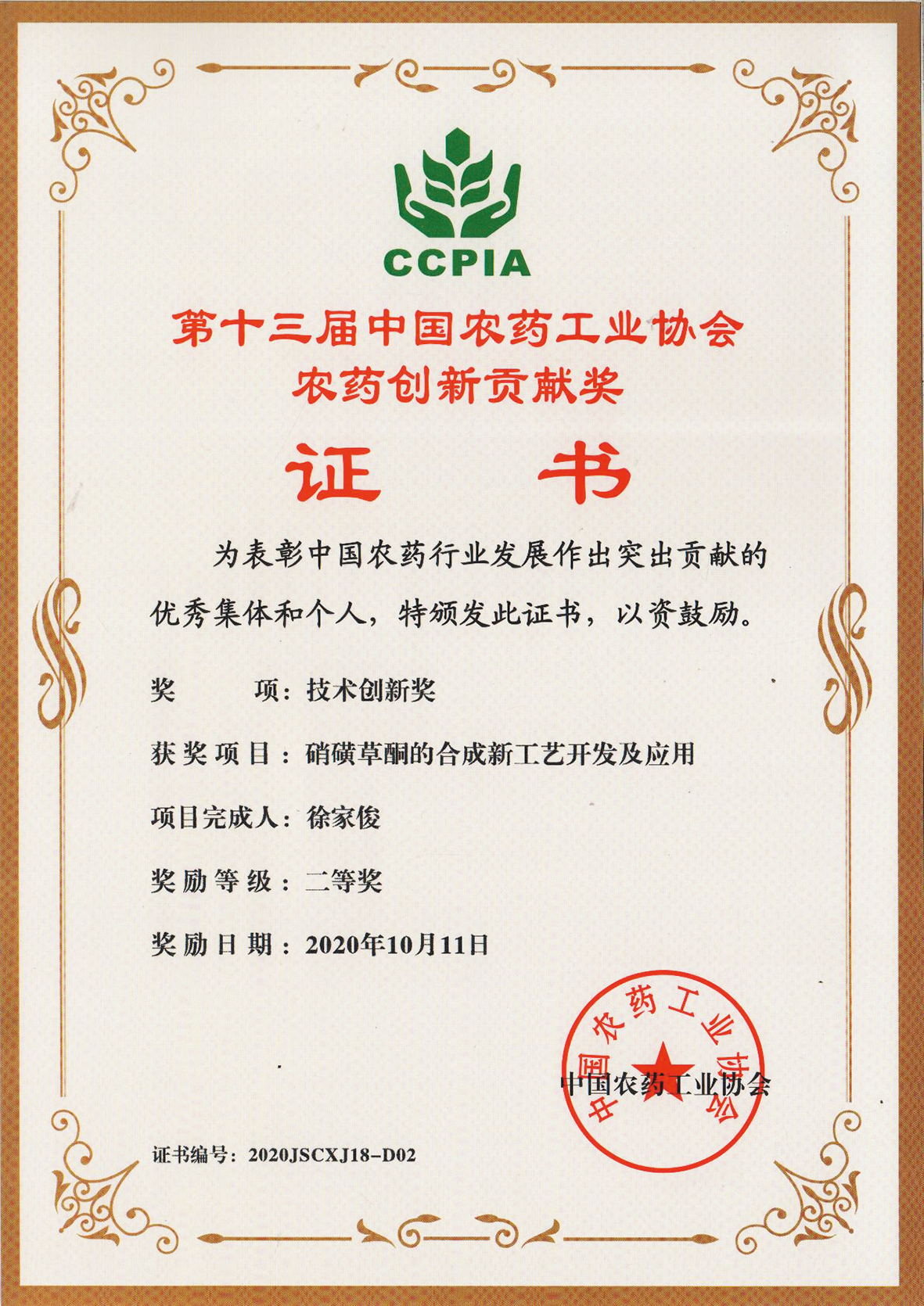 ■2020-11-05 我公司“硝磺草酮的合成新工藝開發(fā)及應(yīng)用”項(xiàng)目榮獲技術(shù)創(chuàng)新獎